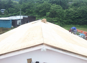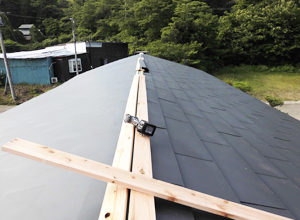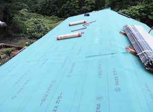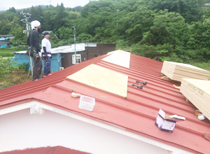 既存の赤い屋根に、コンパネ・ルーフィング施工後、その上に屋根を葺いていきます。